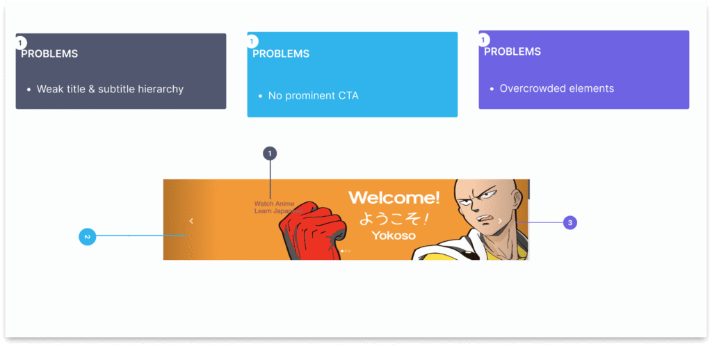 A close analysis of Animelon’s homepage revealed several usability and visual design problems affecting navigation, clarity, and accessibility.