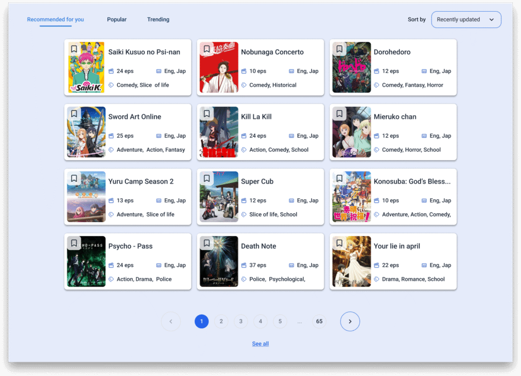 4. Anime catalog section (cards + filters)