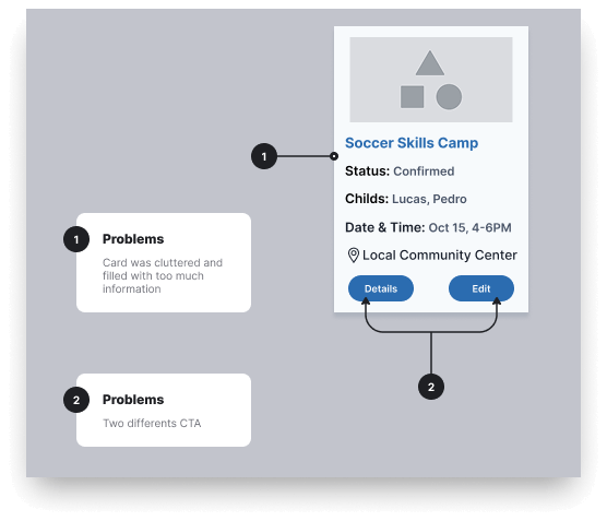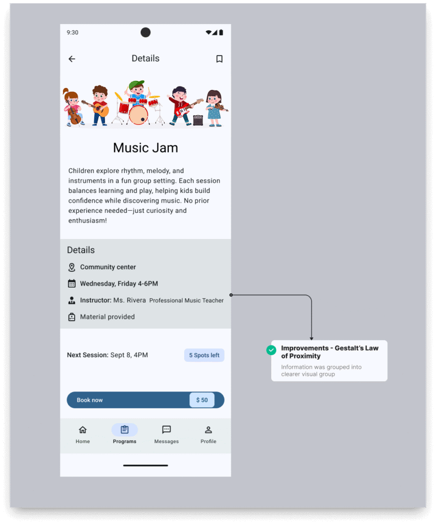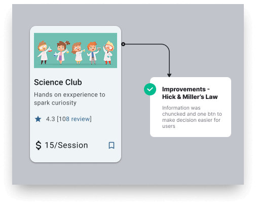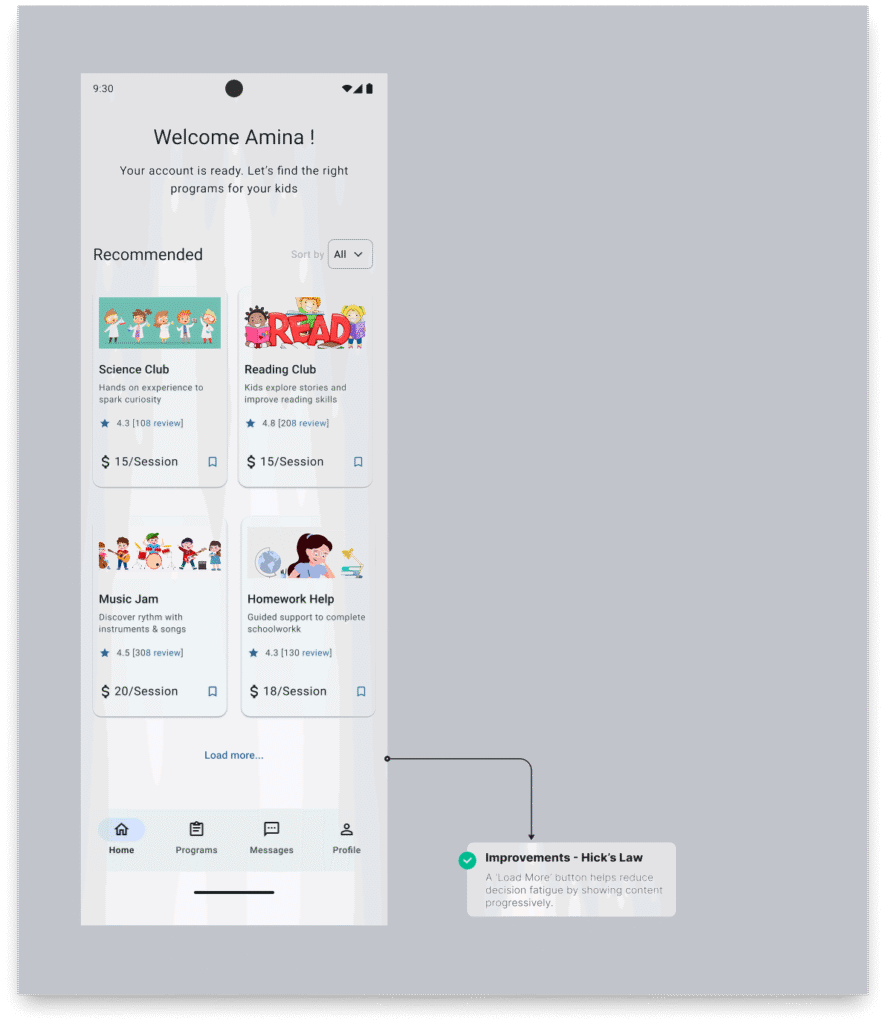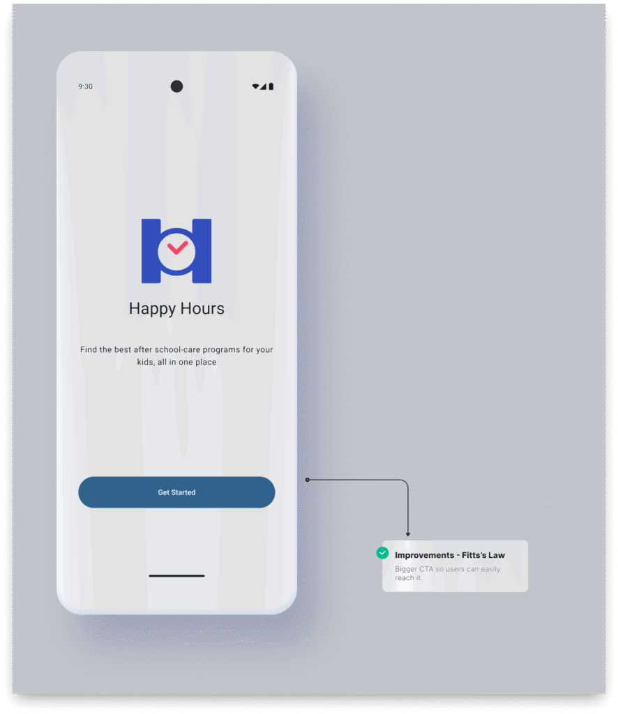 With this foundation in place, I refined each screen using key UX laws. The process included “before/after” adjustments based on Hick’s Law, proximity, and Fitts’s Law to reduce cognitive load, improve scannability, and make the app effortlessly usable for parents who are often multitasking. These principles guided the transition from early drafts to a more intuitive and reassuring experience.