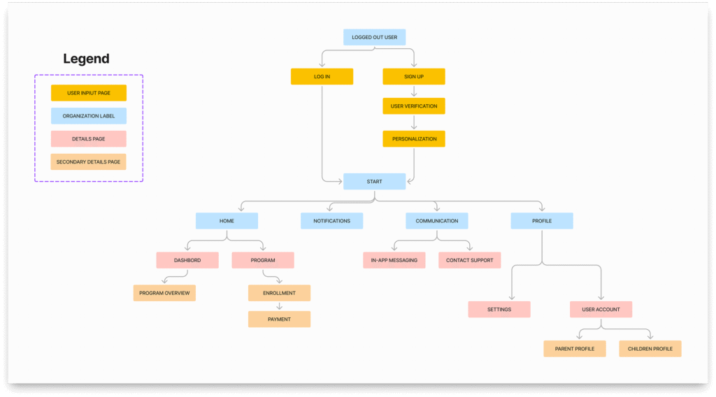 Before touching high-fidelity design, I shaped the information architecture to ensure a natural, predictable flow between home, program details, enrollment, and payments.