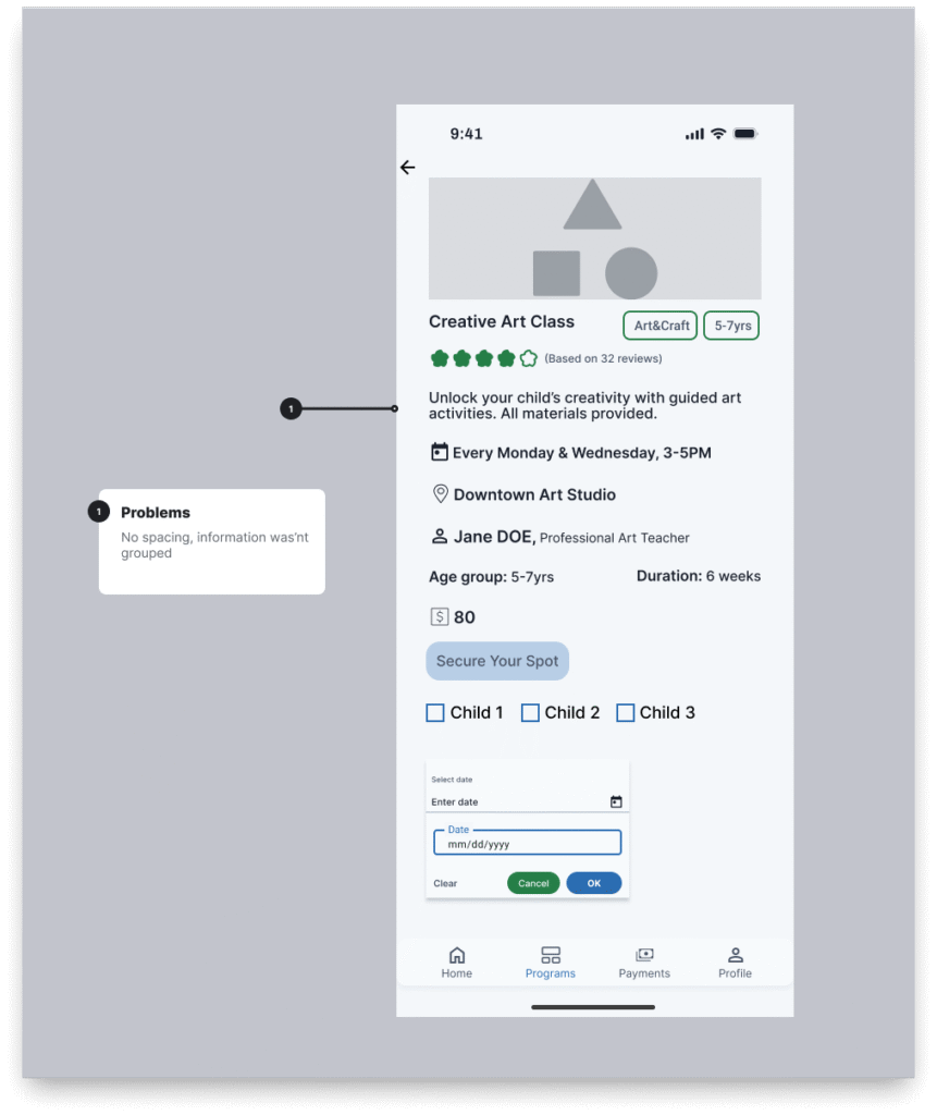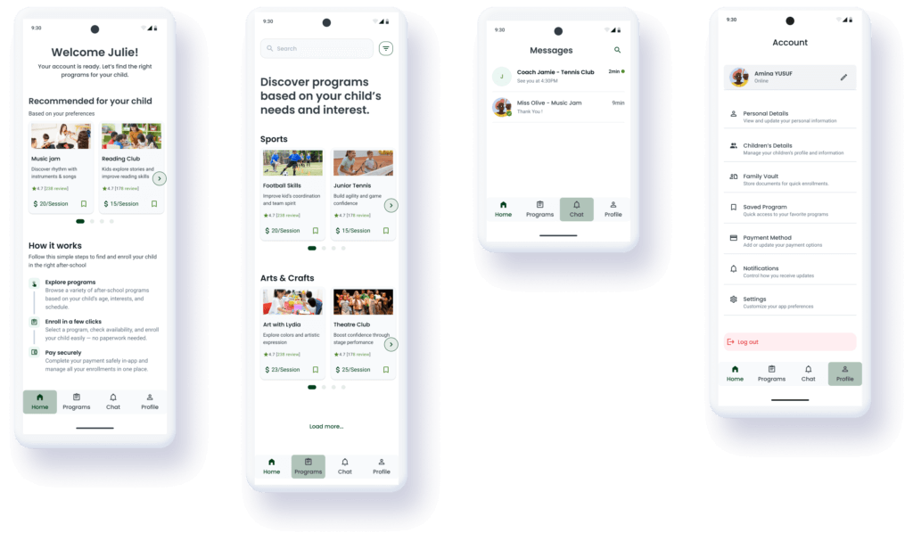 The final design brings together all the UX insights, user testing results, and visual foundations into a seamless experience for busy parents. The interface is intentionally structured, and easy to navigate, ensuring that users can enroll their children, explore new programs, and manage payments with confidence.