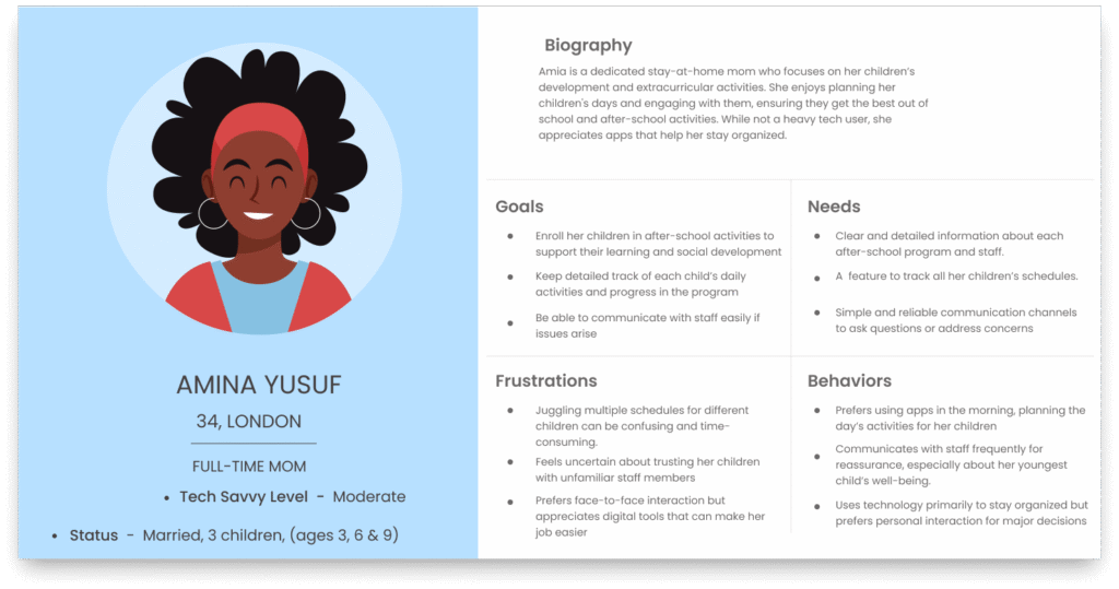 The UX phase began with in-depth research and interviews with parents. From the insights gathered, I created two personas representing different family rhythms and pain points, which helped anchor every design decision in real needs.