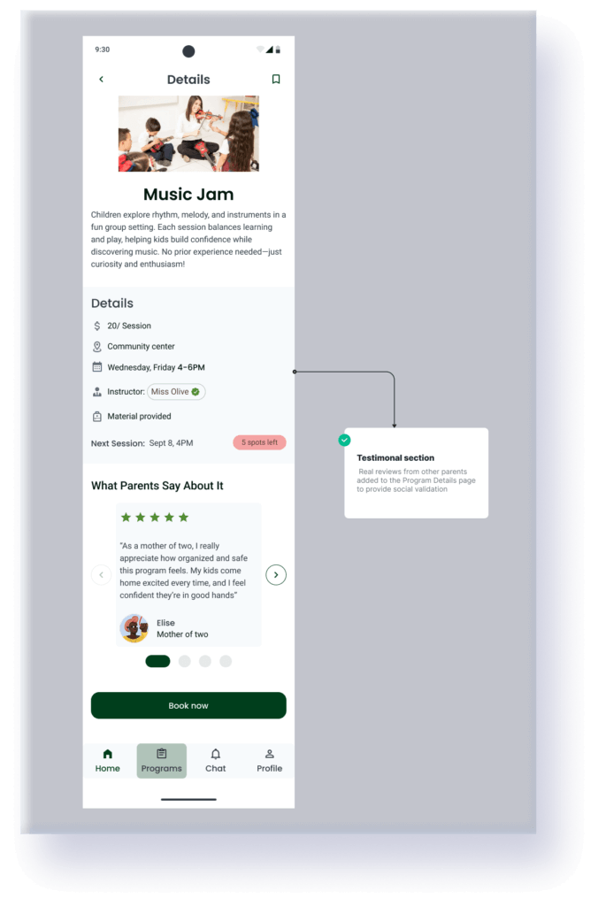 To fully reassure parents like Majid, I introduced a testimonials section: real reviews from other parents added to the Program Details page to provide social validation.